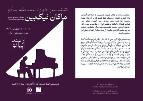 ششمین دوره‌ی جشنواره پیانو ماکان نیکبین، معتبرترین و بزرگ‌ترین رویداد پیانو کلاسیک در ایران، با شکوهی بی‌سابقه برگزار شد. این جشنواره که به‌صورت کاملاً خصوصی و بدون وابستگی به هیچ نهاد یا ارگان دولتی برگزار می‌شود، بار دیگر ثابت کرد که می‌توان با همت بخش خصوصی، فضایی حرفه‌ای و در تراز جهانی برای کشف و پرورش استعدادهای موسیقی کلاسیک کشور فراهم کرد.